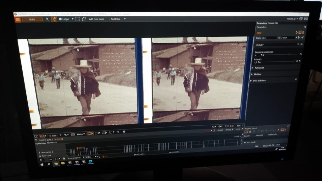 En las imágenes siguientes podemos ver el trabajo de restauración digital de la imagen. La cinta presentaba desvanecimiento de color, manchas y rayas en la emulsión.
